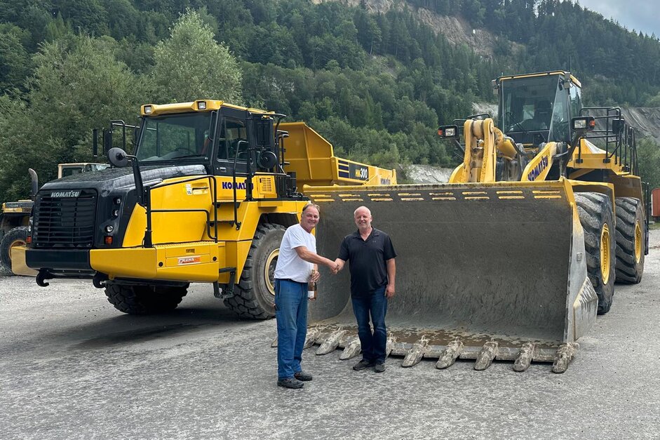 New Komatsu wheel loader and dump trucks in operation at the quarry in Bad Häring